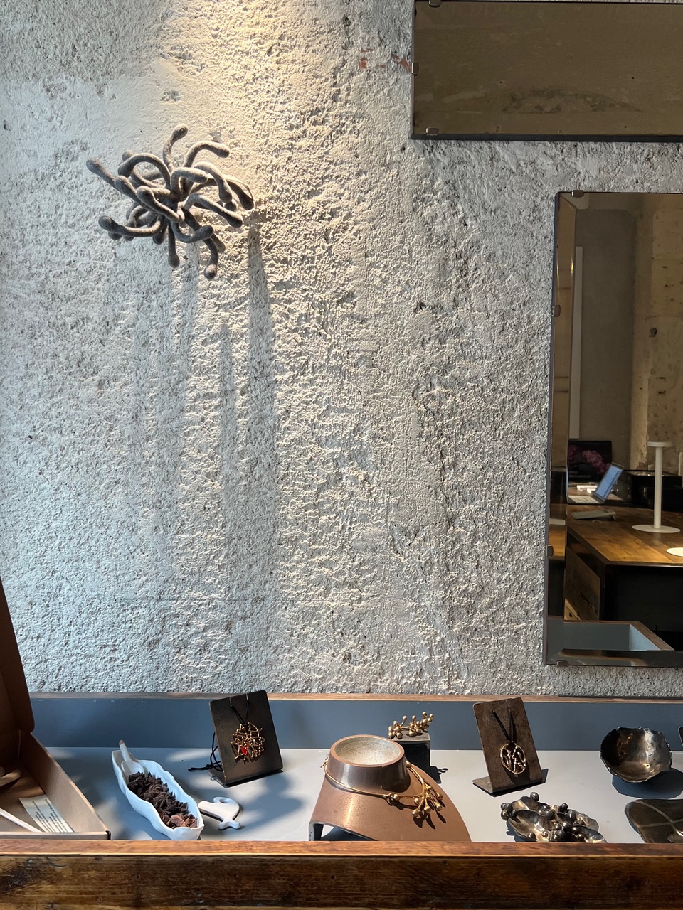 自然光の入る荒壁の店内に整然と並ぶ木材や鉄製の什器、そしてブロンズとシルバーの輝きの融合。